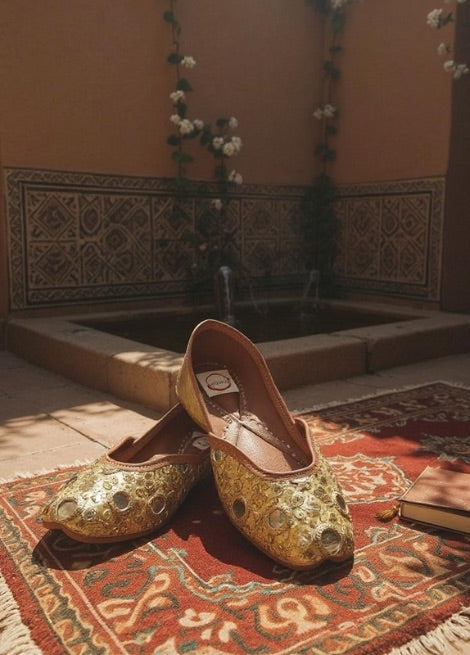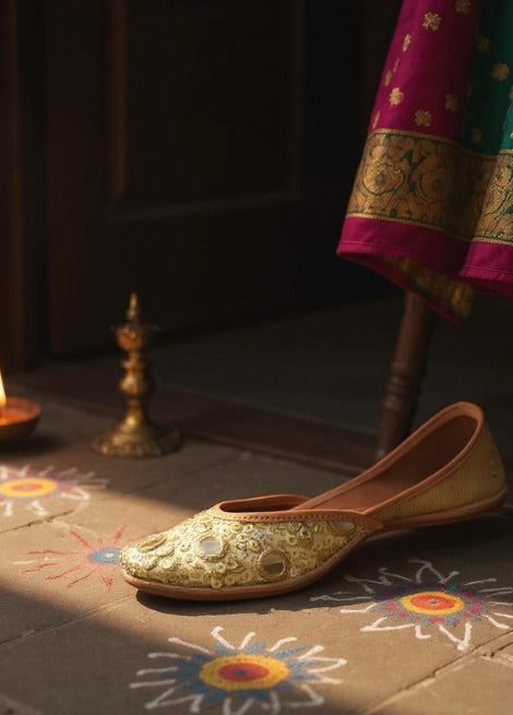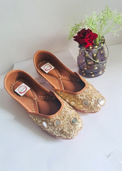 Step into elegance with these handcrafted Dhaga jutti featuring radiant gold sequins and traditional mirror work.Â