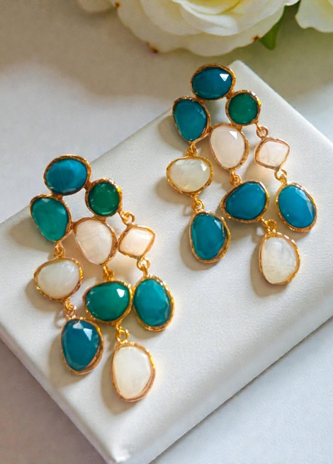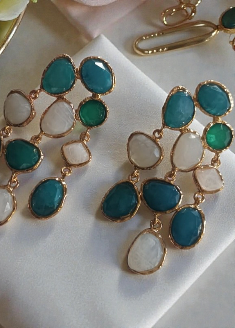 Crafted with layered gemstone-inspired elements in soothing teal, emerald, and pearl tones, these earrings bring a soft luxury feel to every look.