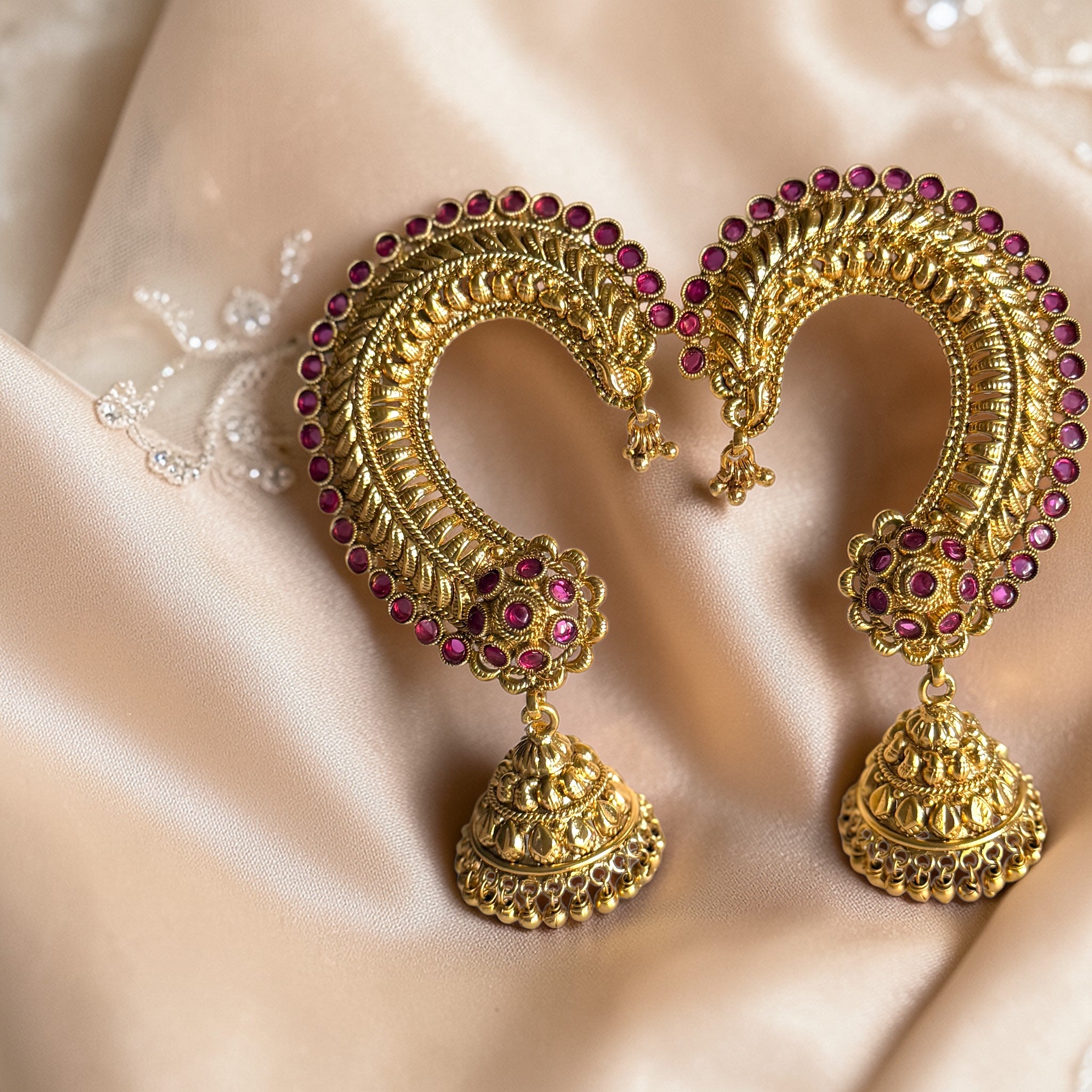 Discover premium gold-finish crescent jhumka earrings with ruby stones. Lightweight, handcrafted, and ideal for weddings, celebrations, and ethnic styling.