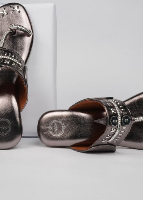 These metallic Kolhapuri are perfect footwear for mehendi nights, festive dinner or just to subtle sparkle to your feet.